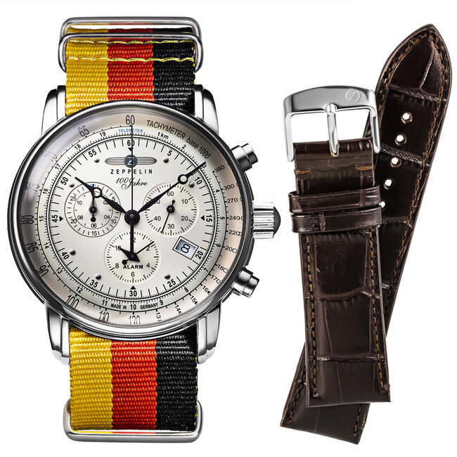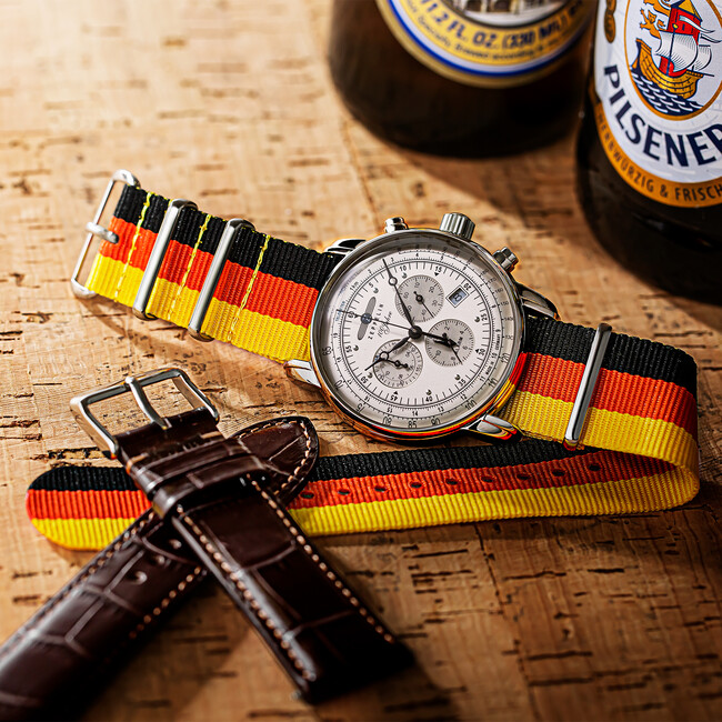 「100周年記念シリーズ クロノグラフアラーム ドイツフェスティバル限定モデル」は、腕時計「ツェッペリン」の人気シリーズ「100周年記念シリーズ クロノグラフアラーム」をベースに、ドイツカラーのナイロンベルトをまとい、本ドイツフェスティバル限定で登場。替えベルトとしてブラウンの型押しレザーベルトが付属します。