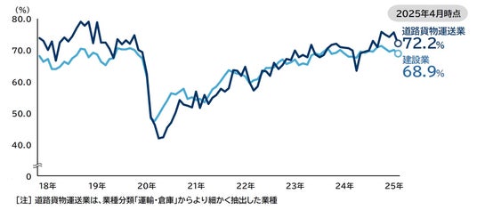 そのほか、2024 年 4 月に時間外労働の新たな上限規制が適用された「2024 年問題」から1年が経過したなかで、正社員の人手不足を感じている企業は、建設業で68.9%、道路貨物運送業で72.2%となり全業種(51.4%)を大きく上回っている。企業からは、「手持ち工事はあるが人手不足の影響が色濃く、生産性が上がらない」(土工・コンクリート事業、東京都)や「仕事はあるが単価が上がらず、人手も足りず利益が減っている」(貨物軽自動車運送、千葉県)のような、案件がありながらも人手不足によって受注に至らないという声が相次いでいる。