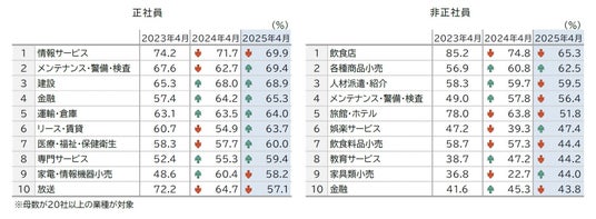 非正社員では「飲食店」が65.3%となり、業種別で最も高かった。依然として高水準にとどまっているものの、2023年4月(85.2%)、2024年4月(74.8%)と比較して低下傾向にある。同様の傾向にある「旅館・ホテル」(51.8%)も含め、就業者数の多くを占める「非正規の職員・従業員」の数が回復していることや[2]、スポットワーク・DXなどの普及が背景にあるとみられる。その他、個人向けの小売・サービス業を中心とした労働集約型の業種が上位に多くあがった。