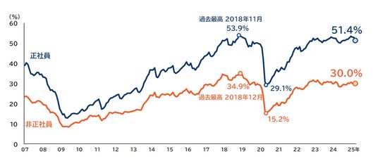 - 正社員の人手不足を感じている企業の割合は、2025年4月時点で51.4%となった。非正社員では30.0%となり、それぞれ高止まり傾向で推移している。