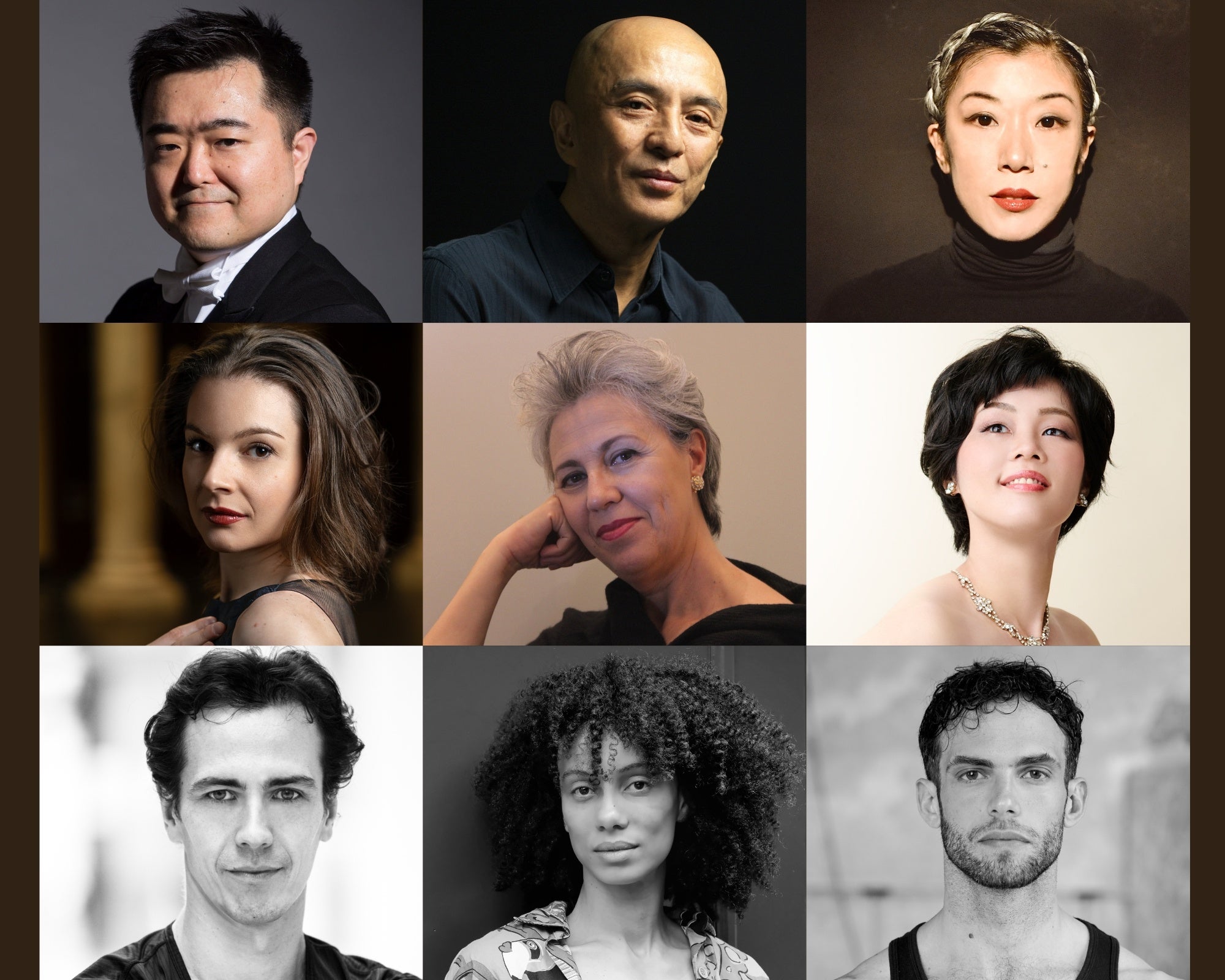 左上より園田隆一郎、勅使川原三郎、佐東利穂子、ベネデッタ・トーレ、サラ・ミンガルド、杉山由紀、アレクサンドル・リアブコ、オフィーリア・ヤング、ハビエル・アラ・サウコ