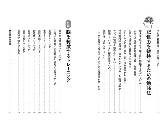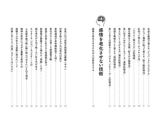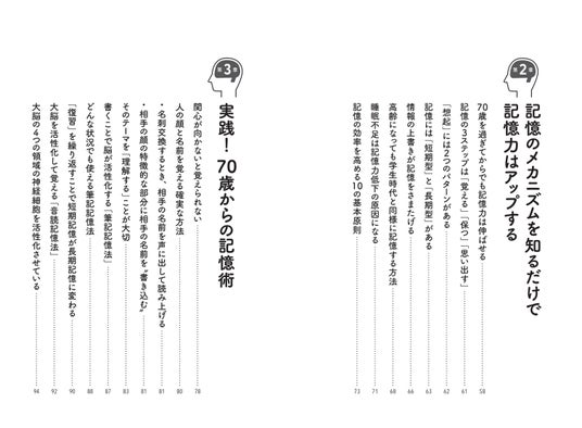 そのほか、脳や記憶にまつわる研究や、記憶のメカニズムについてもやさしく説明。感情を劣化させない技術など、「人生100年時代を賢く・楽しく・幸せに生きる」ための情報が満載。70代・80代だけでなく、前頭葉の萎縮が始まるとされる40代・50代・60代も必読です。