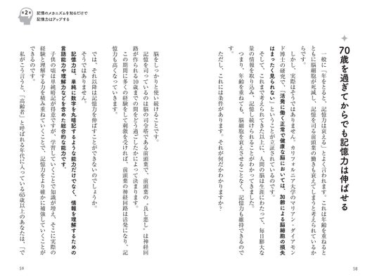 「声に出す」「手で書く」「よく眠る」など、日常の生活で簡単に始められる方法を、記憶のメカニズムや脳に効くポイントとともに紹介。