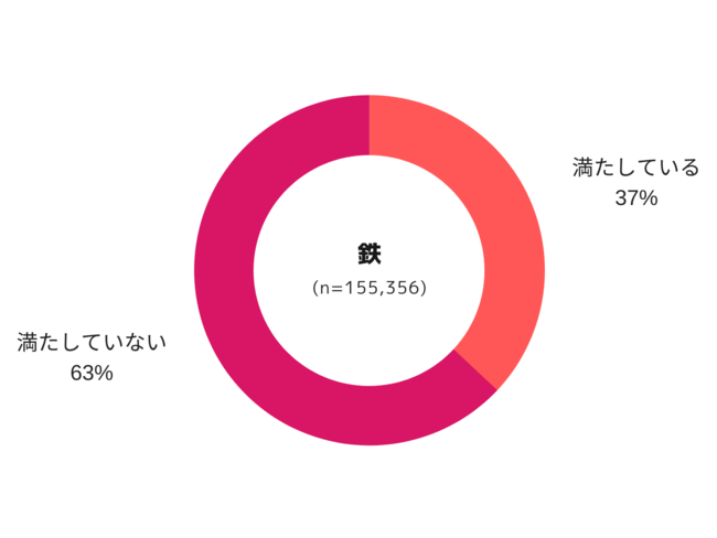 次に、鉄は個人の身長や体重などにより摂取量が異なるため、一般的な推奨量の計算方法※1に基づき『Atleta』に入力された選手の身長、体重、性別に応じて個人ごとに算出した摂取量の目安(10mgまたは15mg)を満たしているかを調べました。その結果、摂取量の目安を満たしているのは57,523件で37.0%、満たしていないのは97,833件で63.0%となりました。