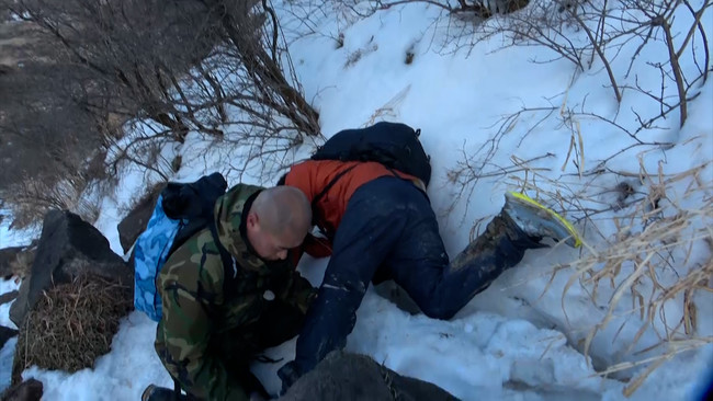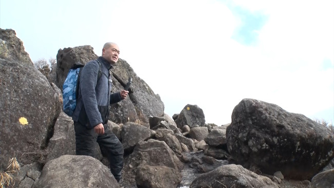 九州の最高所にある温泉を目指し、冬山を登るあばれる君&ロケ隊。
