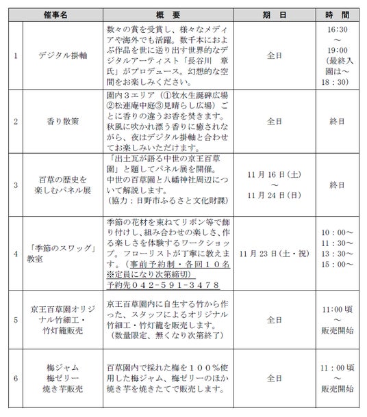 11月23日(土・祝)には、フローリストによる丁寧な指導で世界に一つだけのスワッグ作りを楽しめる「季節のスワッグ教室(京王グリーンサービス株式会社主催)」を開催します。また、京王百草園オリジナルの竹細工・竹灯籠や園内で採れた梅を100%使用した梅ジャム・梅ゼリー、焼き芋などを販売するほか、日野市ふるさと文化財課協力による「百草の歴史を楽しむパネル展」を実施します。