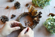 園内で採れた木の実やアジサイのドライフラワーなどを使って、世界に一つだけのオリジナルリース作りが楽しめます。道具や材料は全て当園で用意しているので、手ぶらでも気軽にご参加できます。
