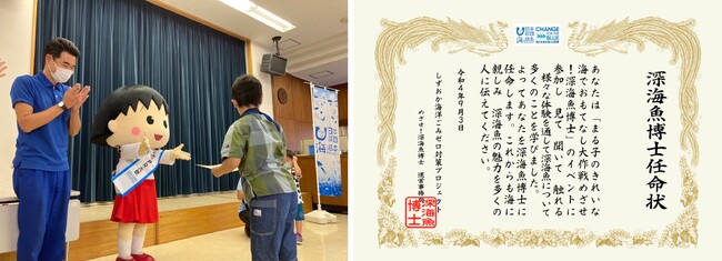イベントの最後には、深海魚や海についての理解を深め、学んだ証として「深海魚博士」の任命状を子どもたち全員に授与しました。しずおか海用ごみゼロPR大使のちびまる子ちゃんより任命状が授与され、笑顔でイベントを無事に終えることができました。これからも、今回の学びを忘れずに、深海魚の魅力や海の環境について多くの人に伝えていってほしいと伝え、締めくくりとなりました。