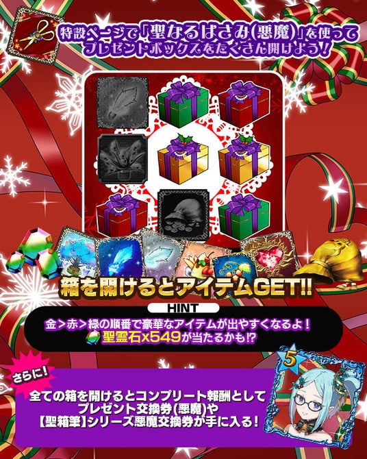 プレゼントボックスを全て開けると、コンプリート報酬として悪魔のサイン&ひとことが入ったイラストの使い魔と交換することができる「【聖箱筆】シリーズ悪魔交換券」や、豪華報酬と交換できる「プレゼント交換券」が獲得できます。