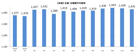 【派遣】全国・全職種平均時給は1,431円。前月比-8円。前年同月比+54円。
