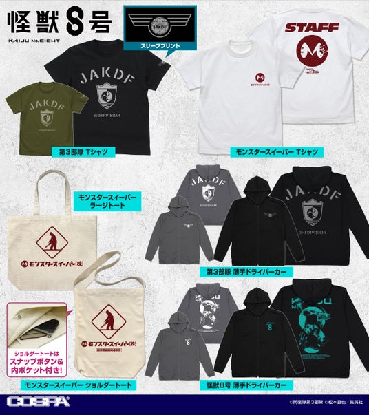 アニメ『怪獣8号』より、ドライパーカー、ステッカー、トートバッグなど、「怪獣8号」の世界観を楽しめるグッズがCOSPA(コスパ)から続々登場。
