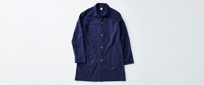 ジーンズの聖地として知られる倉敷・児島を拠点に、60年にわたり有名ブランドのOEMをはじめデニム製品を手がけてきた「中重」。そのファクトリーブランドである「ONO+8186」のショップコートは、中重のノウハウと熟練の職人の技が詰まった縫製技術から生み出されました。タイトでキレイなシルエットですがストレッチデニムのため、着心地が窮屈になることはありません。真っ白の生地でコートを縫い上げてから後染めする「製品染め」を採用し、その独特の風合いも楽しめます。
