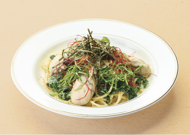 特長:肉厚な広島県産カキをそのまますりつぶして仕込んだ、特性魚介ソースの贅沢パスタ。凝縮した旨みを堪能できます。3粒の大振りのカキ、香り高い海苔と共にお楽しみください。