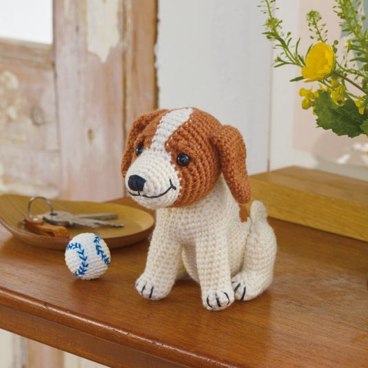 編みぐるみの連載もスタート! 干支の編みぐるみが毎年大人気の福村弘美さんが、毎月1点動物の編みぐるみを紹介します。 4月号は、愛くるしい子犬の作品。