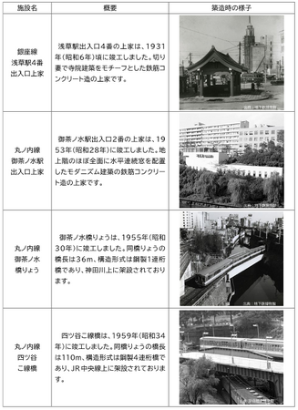 当該施設はいずれも建設から50年以上が経過しており、かつ建設当時の意匠を保っていることが評価されております。また、丸ノ内線の御茶ノ水橋りょう及び四ツ谷こ線橋は、東京都に所在する土木構造物として、初の登録有形文化財となります。