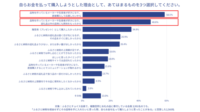 また、その品物を手に入れたいと思った際、自らお金を払って購入しようと思った人(2,560名)にその理由を尋ねたところ(複数回答)、最も多かった回答は「品物を作っているメーカーや生産者が好きになり、直接購入して応援したいから」(約59%)、次点が「品物を作っているメーカーや生産者が好きになり、返礼品以外の品物にも興味をもったから」(約49%)でした。