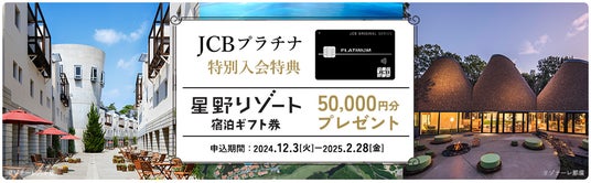 また、2024年12月3日(火)から2025年2月28日(金)の期間中、JCBプラチナへ新規入会されたお客様全員を対象に、「星野リゾート宿泊ギフト券5万円分プレゼントキャンペーン」を実施します。