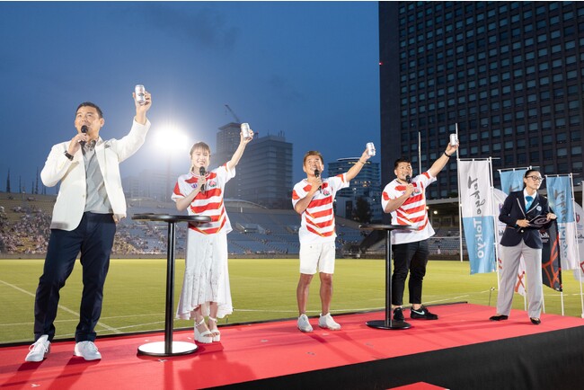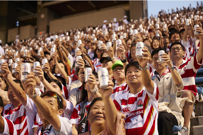 会場では、ラグビーワールドカップ2023フランス大会のオフィシャルビールである『アサヒスーパードライ』が販売され、来場者はビールを片手に、ギネス世界記録(TM)達成の喜びを分かち合いながら、日本代表へ熱い声援を送り、パブリックビューイングを楽しみました。パブリックビューイングは全国各地で開催され、実施会場には東京会場と大阪会場の様子が中継で放映されるなど、日本全国が乾杯でひとつとなりました。