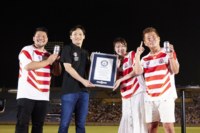 今回の挑戦は、ラグビーワールドカップ2023フランス大会の「ワールドワイド・パートナー」としてパブリックビューイングを盛り上げるために企画しました。アサヒスーパードライ・ラグビーアンバサダーの五郎丸歩さん、アサヒビールラグビー公式サポーターの高山一実さん、元ラグビー日本代表の畠山健介さん、タレントの勝俣州和さんとパブリックビューイングへの来場者に加えて、同日にパブリックビューイングを開催したアサヒビール園 博多店内特設会場(福岡県福岡市)とオンラインでつなぎ、合計1,026名による同時乾杯を実施しました。その結果、これまでのスペインでの記録を更新し、ギネス世界記録(TM)に認定されました。