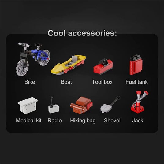 1/12というスケールでは、バンパーやライトなど細部のディティールをブロックで再現し、ややゴツゴツしたフォルムで、ルーフを飾るバイクやツールボックスやショベルなどのミニチュアパーツブロックも付属し、エンジンルームも再現。ジムニーファンにはたまらない遊び心溢れる一台となっております。