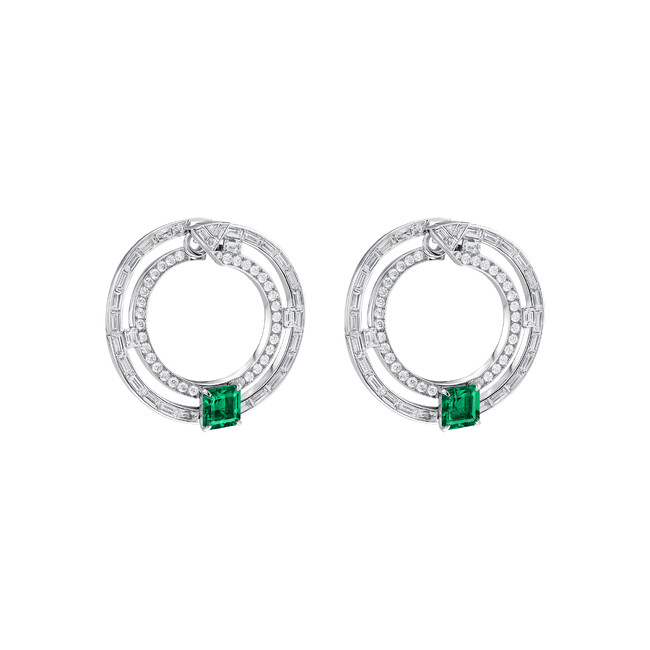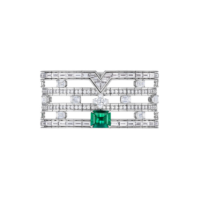 また、ルイ・ヴィトンのハイジュエリーコレクションから、ホワイトゴールド、ダイヤモンド、エメラルドのイヤリングとブレスレットを着用しました。