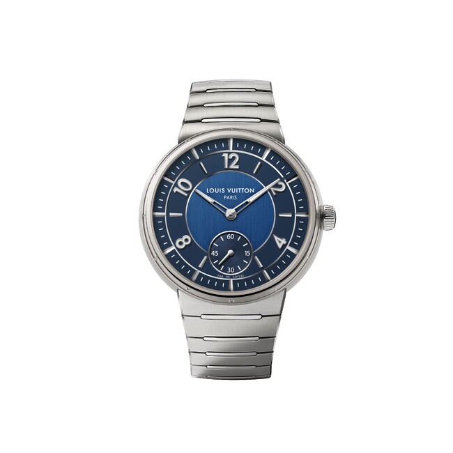 また、ネイビーの文字盤を搭載したスティール製の新作ウォッチ「タンブール」を着用しました。