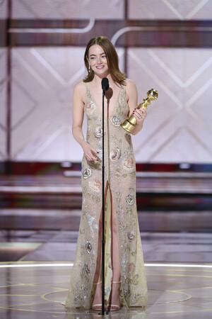 「ミュージカル・コメディ部門主演女優賞」を受賞したエマ・ストーンは、スパンコールのフラワーモチーフが刺繍された深いVネックのガウンに、サテンのサンダルをコーディネート。