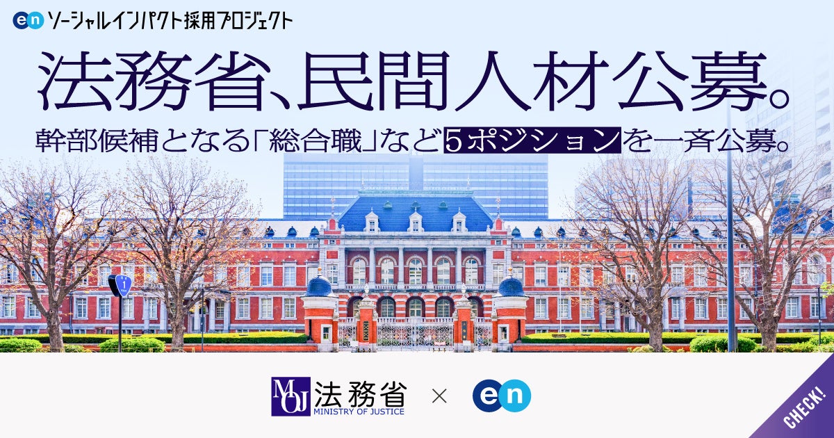 エン株式会社(本社:東京都新宿区、代表取締役会長兼社長:越智通勝)は、2025年10月23日(木)より、法務省の『ソーシャルインパクト採用プロジェクト』(https://www.enjapan.com/)を開始しました。当社が運営する採用支援サービスを通じ、総合職など5ポジションを公募します。下記本プロジェクト概要と法務省 赤木 寛隆氏のコメントを紹介します。