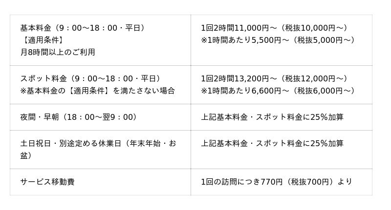 ※上記料金表は東京都、神奈川県での料金です。サービス実施地域により、料金が異なります。