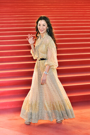 4月16日に開催された、第41回香港映画賞のレッドカーペットに登場した、ミシェル・ヨー。マリア・グラツィア・キウリによる2023年春夏 コレクションより、刺繍があしらわれたイエローのシルクドレスにベルトを合わせた装いを披露しました。