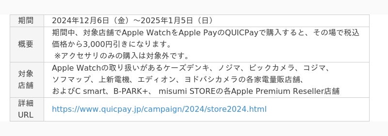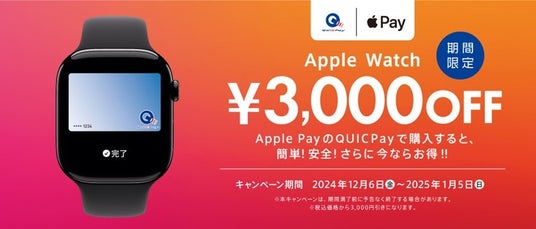 株式会社ジェーシービー (本社:東京都港区、代表取締役兼執行役員社長:二重 孝好、以下:JCB)は、2024年12月6日(金)から2025年1月5日(日)まで、対象店舗でApple WatchをApple PayのQUICPayで購入すると、税込価格から3,000円引きになる「Apple Watch購入キャンペーン」を実施します。
