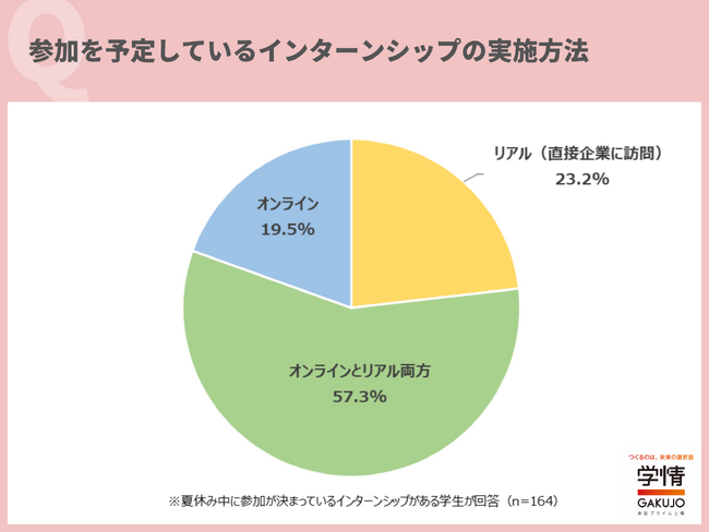 夏休み中に参加するインターンシップの実施方法は、「オンラインとリアル両方」が57.3%で最多。次いで、「リアル」23.2%、「オンライン」19.5%となりました。「リアル」と「オンラインとリアル両方」を合わせると、約8割の学生は参加するプログラムの一部または全部で、「リアル」での体験を予定していることが分かります。