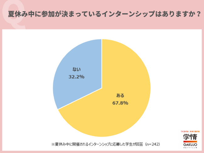 夏休み中に開催されるインターンシップに応募している学生のうち、夏休み中に参加予定のインターンシップが「ある」と回答した学生は67.8%でした。約7割の学生が、夏休み中に参加するインターンシップを決めていることが分かります。