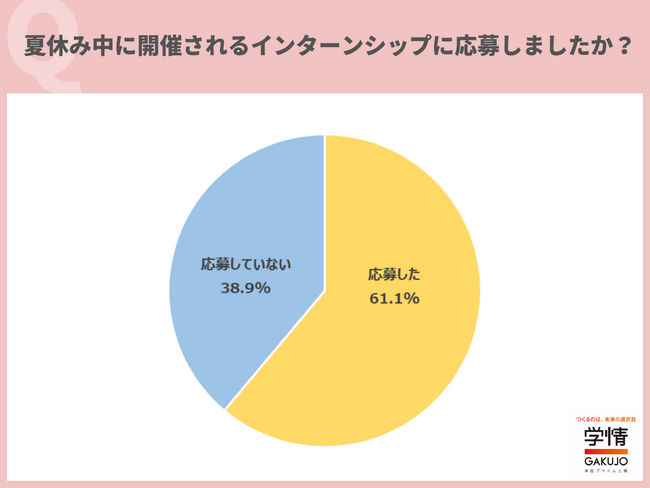 夏休み中のインターンシップ参加を希望している学生のうち、インターンシップに「応募した」と回答した学生は61.1%でした。「応募していない」の回答は38.9%となっています。