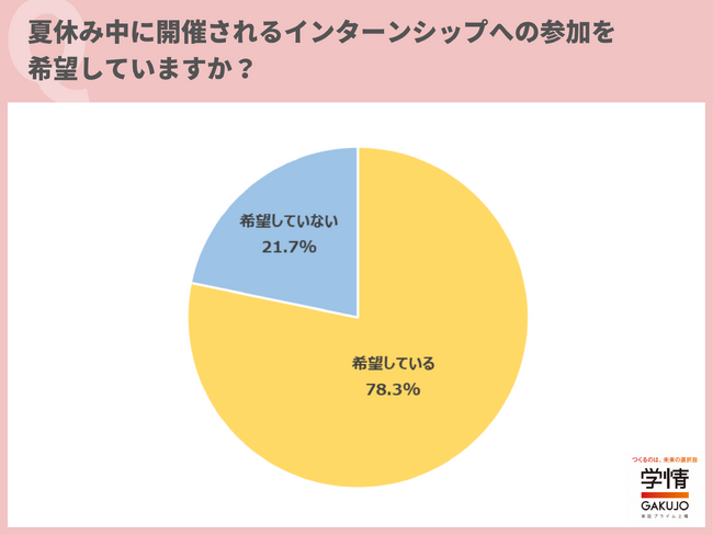 夏休み中に開催されるインターンシップについて、参加を「希望する」と回答した学生が78.3%に上りました。8割に迫る学生が、夏休み中にインターンシップへの参加を希望していることが分かります。「希望する企業に就職するためには、3年生の夏休みの過ごし方が大切だと思う」「まとまった時間があるときにインターンシップに参加したい」「就業体験を通して、自身が活躍できる仕事を見つけたい」などの声が寄せられました。