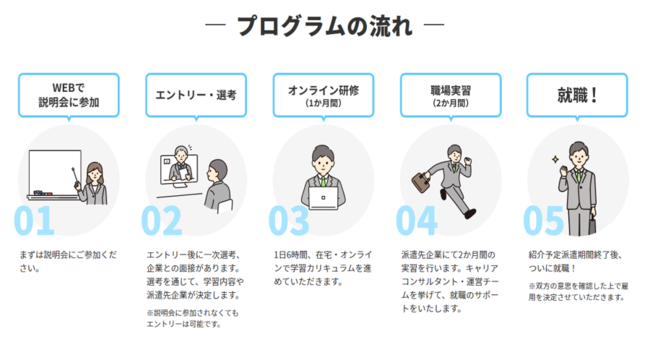 「雇用予定型リカレント教育事業」では、企業が人材に求めるスキル・人物像をあらかじめ明確にした上で、それに応じて求職者が1か月間のオンライン研修と2か月間の職場実習を行います。求職者は、この間も給与を得ることができます。このように、学びながら給与を得つつ、就職を目指せる仕組みを導入することで、金銭的な課題を感じずにリスキリングに挑戦できる人を増やすとともに、求職者の就職と業務での活躍を目指します。