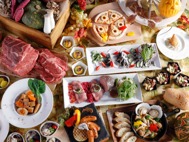 【メニュー例】ビーフステーキの鉄板焼き / 骨付きソーセージ 粒マスタード添え / ハロウィーンピザ /