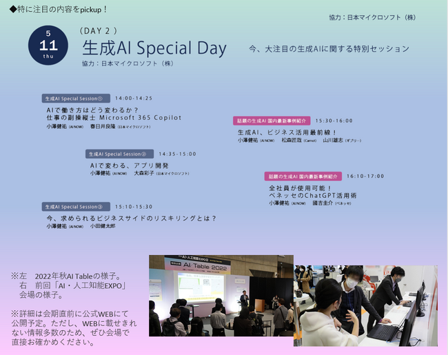 そこでは、生成AIの体験コーナーや、生成AIに関する特別セッションも実施します。この機会をお見逃しなく!
