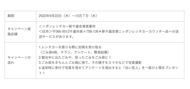 車を借りる際に「CFBごみ袋」と「趣旨説明のチラシ」「海洋ごみに関するアンケート」を渡し、旅行中に出たごみは、ごみ箱にきちんと捨てる事とその様子を写真に撮る事を依頼。車の返却時にその写真を受付に見せ、海洋ごみアンケートに答えると、北海道みやげとして長年絶大な人気を誇る「白い恋人」をプレゼントする内容となっています。