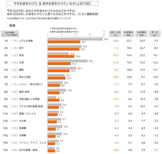 - 3位「貯金」は「今年お金をかけた」を来年の意向が上回り、その差分は+4.2ptです。ほかにも、9位「老後の暮らしの準備」(来年8.4%、今年6.1%、差+2.3pt)で今年より来年が高く、長期的なお金の使い方や将来への備えに目を向ける姿勢も感じられます。