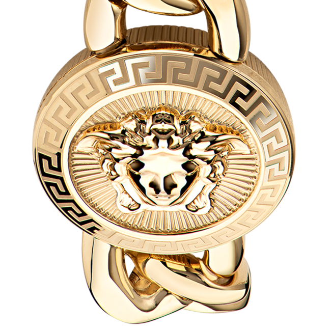 メドゥーサに加え、トップリングやインデックス、ブレスレットのスタッズ部分など、随所にグレカロゴをデザイン。ブレスレットの立体感が、品のよさを演出します。