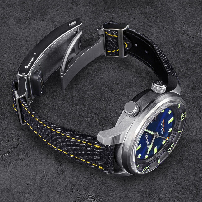 ファッションのワンポイントとして時計を取り入れられる、デニムベルトを採用。ステッチのカラーも数十色から選び、インデックスと相性の良いイエローを選びました。