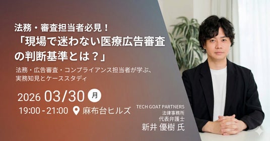 本セミナーでは、IT・マーケティング分野に精通し、自身も経営者として活動する新井優樹弁護士(TECH GOAT PARTNERS法律事務所)を講師に迎え、「現場ですぐに活用できる判断基準」を主眼に置いて解説いただきます。また、セミナー後には参加者同士の交流会を実施し、現場特有の悩みやノウハウを共有できる場を提供いたします。