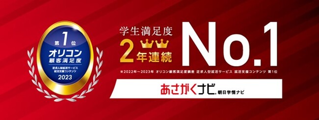株式会社学情(本社:東京都千代田区)が運営するスカウト型就職サイト「あさがくナビ」が、オリコン顧客満足度調査で「就活支援コンテンツ」第1位に選出されました。第1位への選出は、2022年に続き2年連続となります。「あさがくナビ」は2019年に、ダイレクトリクルーティングサイトにフルリニューアルして以降、学生に1つでも多くの選択肢を示すため、スカウト機能のアップグレードや、求人情報・就活支援コンテンツの拡充を図ってきました。今後も学生にとって使いやすいサービスを提供し、学生と企業の価値あるマッチングを実現してまいります。