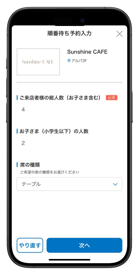 順番待ち予約入力画面