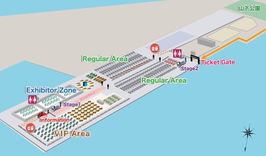 横浜を中心に活躍する10名のDJやアーティストがステージを盛り上げ、ご当地グルメをはじめとする12台のキッチンカーで食事も満喫できます。