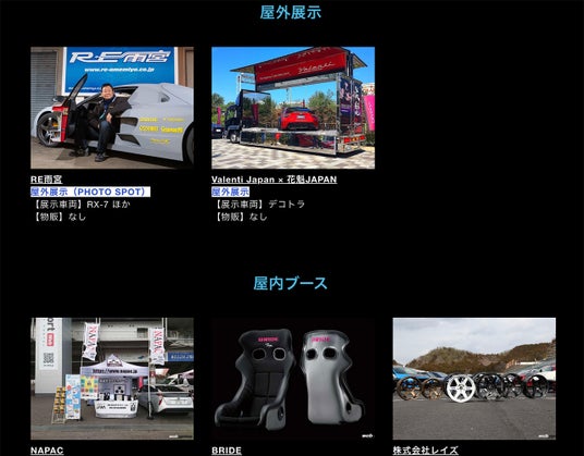 RE雨宮 アマさん、トップシークレット“スモーキー永田”さん、ヴェイルサイド横幕さん、ラフ・ヴェルト中井さんなどカスタムカー業界の重鎮たちも来場予定です。