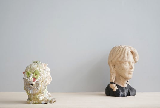 新井浩太《ゆれる皮膚_しゅ像》(左)、上野聖人《The head statue 2》(右)