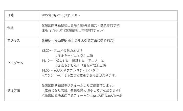 日時:2022年9月24日(土)13:30~ 会場:愛媛国際映画祭松山会場 河原外語観光・製菓専門学校