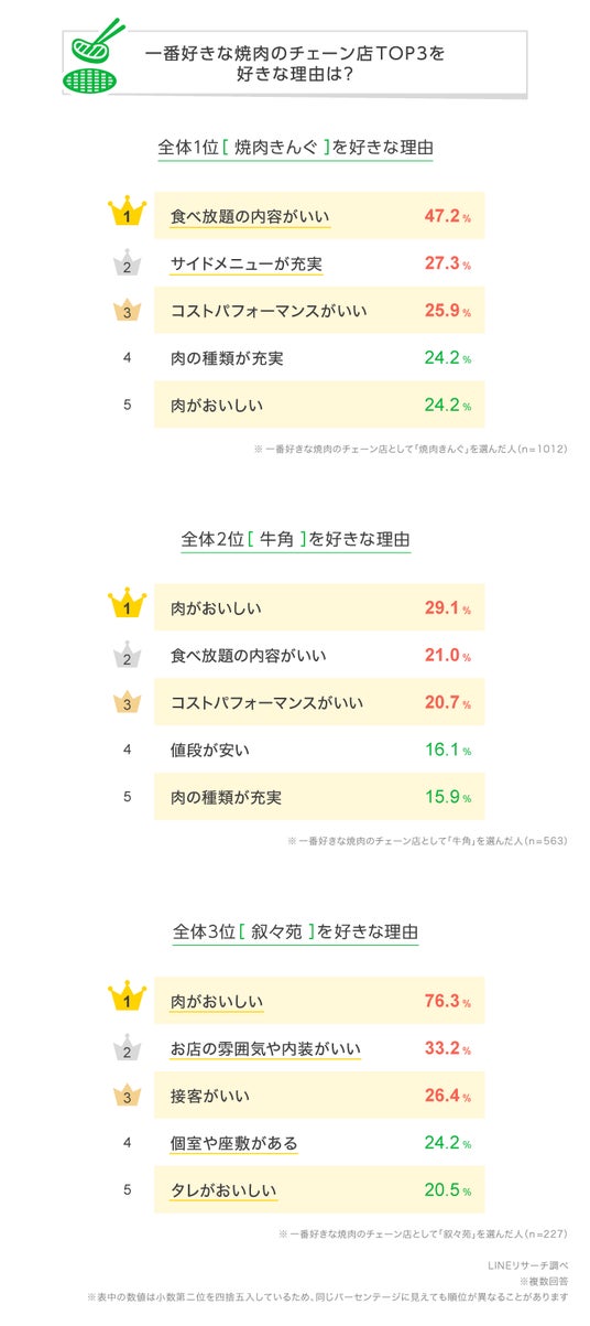 一番好きな焼肉のチェーン店TOP3について、それぞれ好きな理由を聞きました。